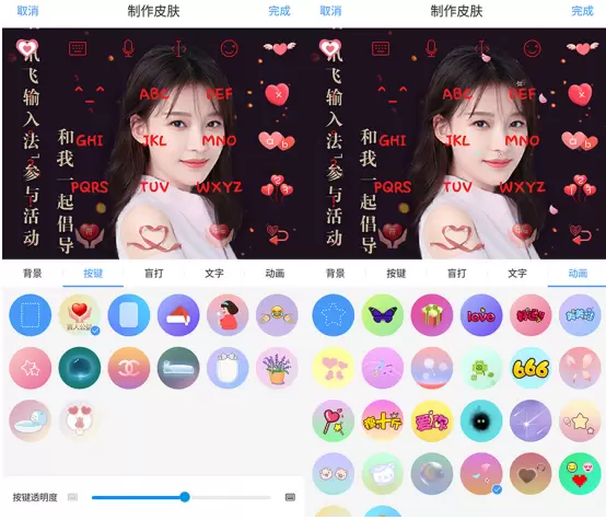 本次活动最大亮点,讯飞输入法还邀请粉丝加入公益行动,为自己的“爱豆”DIY明星皮肤。打开讯飞输入法皮肤功能,选择【自定义】可定制盲人公益的按键也可搭配活泼的动画效果,和“爱豆”来一次亲密接触。