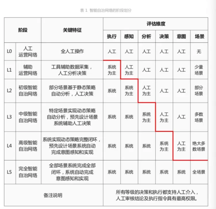 白皮书将智能自治网络划分为6个阶段,分别包括人工运营网络(L0)、 辅助运营网络(L1)、初级智能自治网络(L2)、中级智能自治网络(L3)、高级智能自治网络 (L4)、完全智能自治网络(L5)这六个阶段。