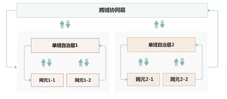 为了逐步达成智能自治网络的目标,白皮书指出,这需要基于“分层自治、垂直协同”的网络架构来实现。架构上的分层实现,保证了不进一步增加网络的复杂性,并确保了智能自治网络的最佳性能。智能自治网络的分层架构,包含跨域协同层、单域自治层和网元层。在不同层次闭环之间,例如跨域闭环和各单域闭环之间,需要通过开放接口(开放API、SDK等)相互协调和交换信息。