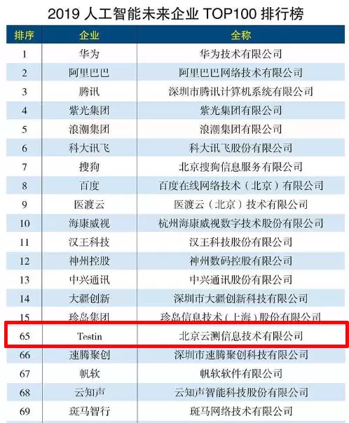 2019年10月29日,中科院《互联网周刊》&eNet研究院发布“2019人工智能未来企业TOP100”榜单。Testin凭借在人工智能领域的创新探索与众多应用落地场景与华为、科大讯飞、字节跳动、商汤科技等人工智能领域的杰出企业共同入选“2019人工智能未来企业TOP100”