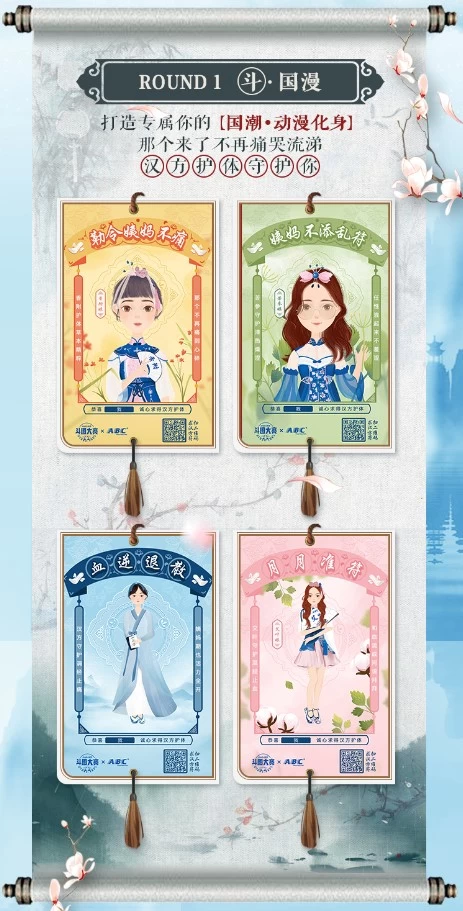 汉服华妆衣袂飘扬,春花秋月曲水流觞……结合二次元国风的“川芎娘、当归娘、艾叶娘、香附娘、苦参娘”五位汉方娘为参赛的小伙伴们带来健康的BUFF魔法,使用国潮H5生成不同服饰的汉方娘动漫化身,搭配美图秀秀的汉方元素斗图工具效果更佳,打开脑洞,秀出你的超A国潮范吧!