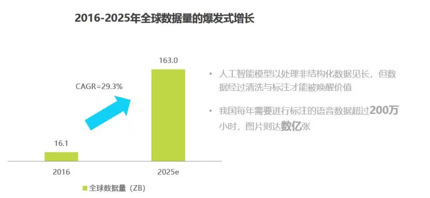 PC、互联网、消费级移动设备的兴起宣告了数据时代的来临,数据量呈指数式增长,据IDC统计,全球每年生产的数据量将从2016年的16. 1ZB猛增至2025年的163ZB,其中80%-90%是非结构化数据。过去计算机主要处理结构化数据,人工智能模型却以处理非结构化数据见长,但“玉环琢不成器” ,数据经过清洗与标注才能被唤醒价值,这就产生了源源不断的清洗与标注需求。在我国,每年需要进行标注的语音数据超过200万小时,图片则有数亿张。