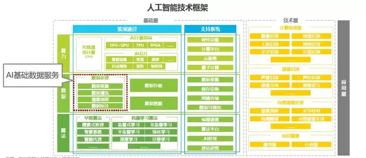 人工智能基础数据服务指为AI算法训练及优化提供的数据采集、清洗、信息抽取、标注等服务,以采集和标注为主。人工智能概念爆发伊始,算法、算力、数据就作为最重要的三要素被人们乐道,进入落地阶段,智能交互、人脸识别、无人驾驶等应用成为了最大的热门,AI公司开始比拼技术与产业的结合能力,而数据作为Al算法的“燃料”,实现这一能力的必要条件。因此,为机器学习算法训练、优化提供数据采集、标注等服务的数据服务成为了人工智能发展热潮基础。如果说计算机工程师是Al的老师,那基础数据服务就是老师手中的教材。