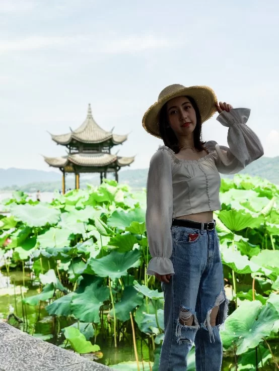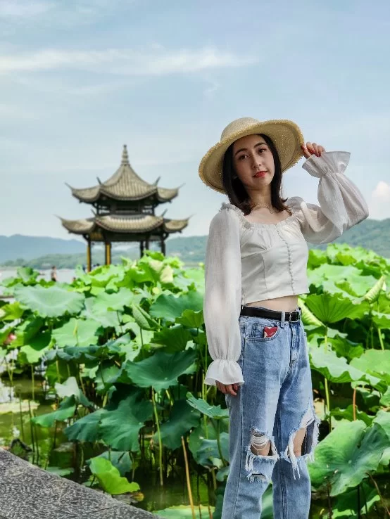 可以很明显地看出,未使用人像技术拍摄的照片主要存在两个问题。一是逆光环境下导致整张照片色调偏暗,尤其人脸部又暗又黑。二是照片主体不突出,人、荷叶、水榭,远处的山丘与天空,内容多,画面平实,没有主次感。