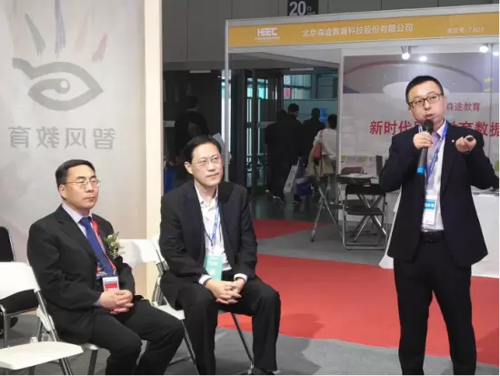 多位专家对智风的新产品表现出浓厚的兴趣并提出很多宝贵意见。下图为中国高等教育学会副秘书长郝清杰先生、江苏省教育厅高教处邵进处长在展位听取公司董事长刘宁海和副总经理孙德龙对新产品的介绍。