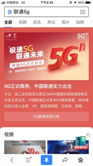 广告主通过与百度APP合作“首发计划”,能够获得搜索通用词的资源。如果你是搜索营销的老手,自然就能知道相较品牌词、品类词等其他词型,通用词能够覆盖最多的潜在受众并获得更高的曝光;在此次与中国联通的合作中,当用户搜索“联通5G”等关键词后,便会触发广告主定制化的创意彩蛋和核心内容,这能在最大程度上集聚消费者的注意力从而取得更好的效果。