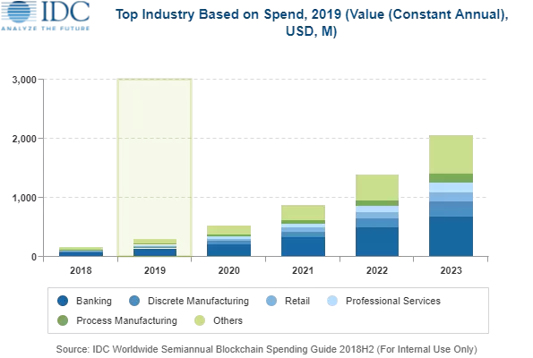 IDC指出,在应用场景上,贸易金融及交易(后)管理、跨境支付和结算、产品溯源、资产和货物管理、法规遵从等排名较为靠前,其2019年中国市场支出均在3亿美元以上。