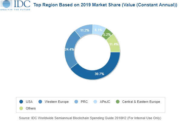 数据显示,在市场规模上,预测期内美国仍是全球区块链投资最大的区域,占全球支出的比重为39%。分列二到五位的是西欧、中国、亚太(不含中国和日本)和中东欧。