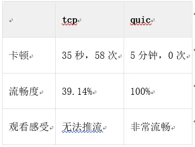 1、在延时 200ms,丢包率10%的弱网环境下,RTMP over TCP推流非常卡,播放器拉流35秒后被断开连接;而RTMP over QUIC推流和播放都很流畅,在持续5分钟的播放过程中0次卡顿,流畅度100%,效果非常好。