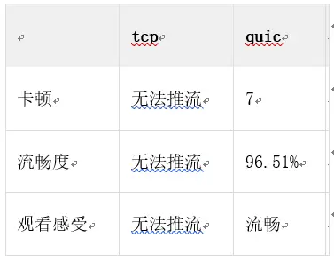 3、在延时 500ms,丢包率 30%的弱网环境下,RTMP over TCP直接无法推流,而RTMP over QUIC推流和播放仍然还是流畅的,在持续5分钟的播放过程中只出现7次卡顿,流畅度96.51%,大多数观众仍能接受。