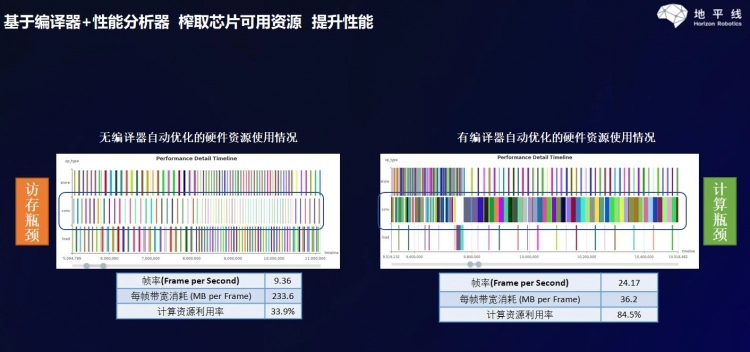 左图显示,在没有经过软硬结合优化前,计算单元是被不停的打断,需要频繁的读取外部的存储,频繁往里输数据。右图则是经过软硬结合的优化之后,计算的有效利用率被大大提高了,计算单元利用率可以达到85%,帧率处理速度达到了24帧/秒,在大大降低跟外部存储交换频率的同时,效率得到了大大的提升,地平线这就是地平线的“软硬结合”。