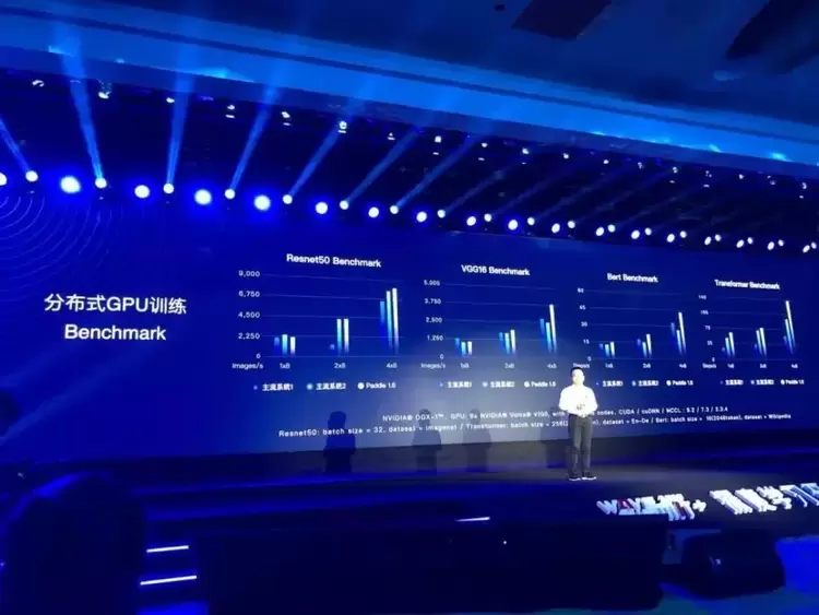 PaddlePaddle把工业领域常用的分布式训练的模型做了Benchmark。开发者可以很方便地找到快速把一个单机的程序变成一个分布式训练程序的程式,并且找到应用最为广泛的一些算法模型,用分布式来进行实现。在这里新增5行代码就能实现高效的GPU并行训练。