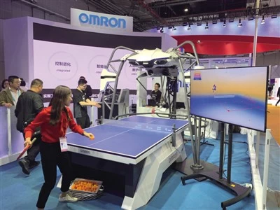 “这是我们的第五代FORPHEUS乒乓球机器人。”欧姆龙展台的工作人员告诉记者,该机器人搭载的是欧姆龙最先进的“Sensing&Control+Think”核心技术,即传感+控制+思考技术。
