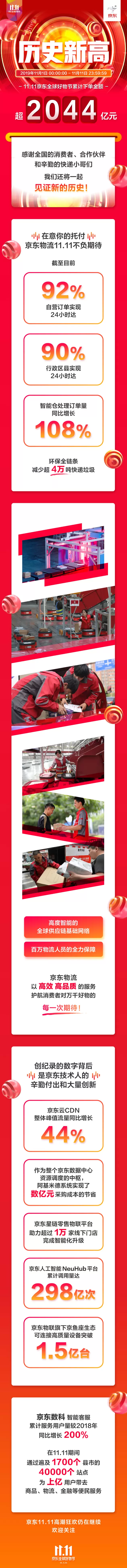 11月12日凌晨消息,京东公布数据称,11.11全球好物节自11月1日零时至11日24时,京东平台累计下单金额达2044亿元。