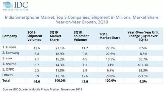 中国小米以27.1%的市场份额继续保持其第一的位置,紧随其后的是三星电子,该公司获得了18.9%的份额,三季度三星在印度销售了880万部智能手机,销量下滑了8.5%。小米和三星电子之间的份额差距在扩大。