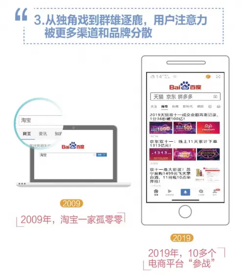 从用户关注度看,2019年双11,用户的注意力被细分渠道和品牌分赛。比如,2009年双11,用户的注意力都集中在了淘宝身上;今年双11,天猫&淘宝、京东、苏宁易购等十多个电商平台开始一起争夺用户注意力。