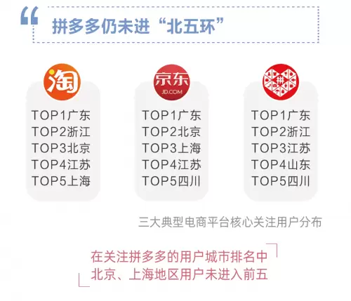 值得一提的是,电商平台发力争夺用户注意力的同时,拼多多走出一条不同的道路,即对下沉市场用户的开拓。《百度2019年双11大数据报告》显示,和天猫&淘宝、京东的用户分布不同,拼多多TOP5用户地区并没有北京、上海,而是广东、浙江、江苏、山东、四川。这也意味着,尽管拼多多在上海、北京等地的存在感依旧不高,但他也完成了另一种逆袭。