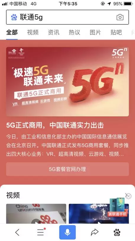 “百度APP首发计划”是百度商业在营销上的又一次探索。这个新广告产品的最大亮点是基于搜索关键词的整合营销,在合作期间当用户搜索“联通5G”这样的关键词时,就能看到中国联通5G套餐包的相关信息。而且,与以往搜索关键词弹出文字创意和网址链接的形式截然不同,现在用户会接触到相关特型内容的聚合展示。