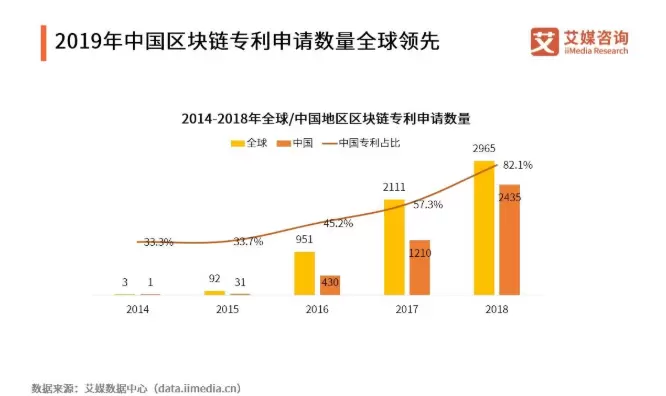 iiMedia Redearch(艾媒咨询)数据显示,2014年以来,全球区块链专利申请数量不断攀升,中国区块链专利申请数量在全球占比逐年升高,2018年占比超八成。