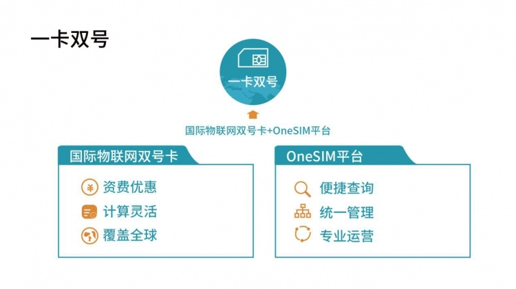 一卡双号包含中国移动本地码号和海外运营商码号,卡内装载智能应用,可根据用户所在地自动切换为当地网络;一卡双号OneSIM平台为企业客户提供全球物联网卡连接管理和运维服务,包括企业信息管理、账户管理及资费管理等功能。产品具有低资费、计费灵活、海外覆盖区域范围广等优势。