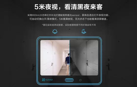 在最危险的夜晚,使用传统猫眼会因为楼道昏暗而无法看清门外状况。萤石DP1S智能猫眼采用850mm大功率红外补光灯搭配低照感光sensor,可自动进行日夜模式切换,远达5米的高清夜视距离,楼道再黑也能看得清。