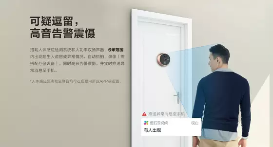 与传统猫眼相比,萤石DP1S智能猫眼大大提高了安全性能,它自带人体感应检测系统和大功率双扬声器,门外6米范围内有人逗留时,DP1S立即启动抓拍、录像,并推送提醒到手机APP,还会发出高音告警,震慑心虚的不法分子,保障家人安全。