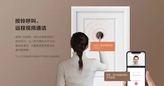 智能猫眼+智能门锁的搭配助力家庭安全加倍升级。当有快递上门时,主人可以通过猫眼实时视频对话快递员,确认身份后,下发临时密码为其开门;当收到家人开锁回家的消息推送时,也可通过猫眼查看是否有异常同行者,家人安全看得见。