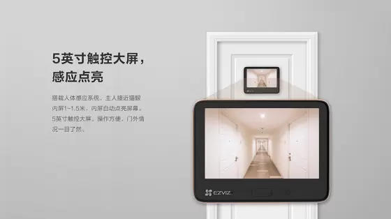 萤石DP1S智能猫眼克服了传统猫眼使用上的不便,只需接入无线网络,就能实现本地或远程可视看家。DP1S搭配的5英寸室内触控大屏,成像清晰画质精致,当主人接近猫眼内屏1-1.5米时,内屏的屏幕自动点亮。在家时,老人孩子可通过猫眼内屏可实时查看门前场景,再也不会为够不着、看不清而犯愁。