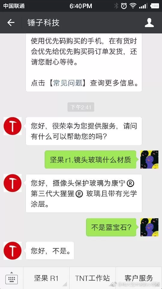 网友在微博晒出与锤子科技客服对话