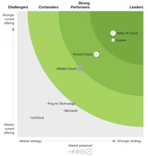 (百度智能云处于中国市场领导者领域最上方,图表来源:百度智能云官微)