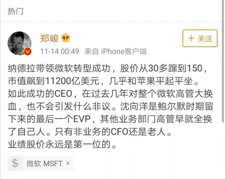 媒体人郑峻评论道:纳德拉带领微软转型成功,股价从30多蹿到150,市值飙到11200亿美元,几乎和苹果平起平坐。如此成功的CEO,在过去几年对整个微软高管大换血,也不会引发什么非议。沈向洋是鲍尔默时期留下来的最后一个EVP,其他业务部门高管早就全换了自己人。只有非业务的CFO还是老人。业绩股价永远是第一位的。
