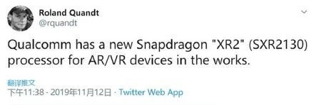 11 月 13 日,知名爆料人士Roland Quandt透露,高通公司正在研发一款全新的AR/VR处理器骁龙XR2(SXR2130),该款芯片主要使用在AR/VR设备中,提升展现虚拟现实的能力。Roland Quandt此前曾准确曝光了一张麒麟 990 的参数,可信度非常高。但是Roland Quandt并没有透露更多的关于骁龙XR2 芯片的信息。