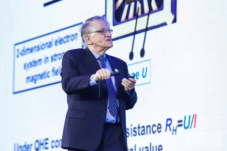 当天举办的15场主旨演讲主要围绕天体物理、物理、生命科学、数学、化学、计算机、计算机神经科学及量子计算等领域展开。1985诺贝尔奖获奖者、中国科学院外籍院士Klaus von Klitzing教授率先开启了科学峰会的第一场主旨演讲。Klaus von Klitzing于1980年在MOSFET器件上发现了量子霍尔效应,并凭此获得1985年诺贝尔物理学奖,开创了固体器件中量子效应研究的先河。在主旨演讲“2019: A Historic Year for Science of Measurements”中他从国际单位制的历史发展出发,阐述了统一国际单位制的重要性,并提到了2019年5月份新的国际计量单位的启用。随后,教授介绍了自己所获诺贝尔物理学奖的成果——量子霍尔效应的发现过程与原理,并分析了其在定义国际单位中的作用,量子霍尔电阻也成为电阻定义的标准。