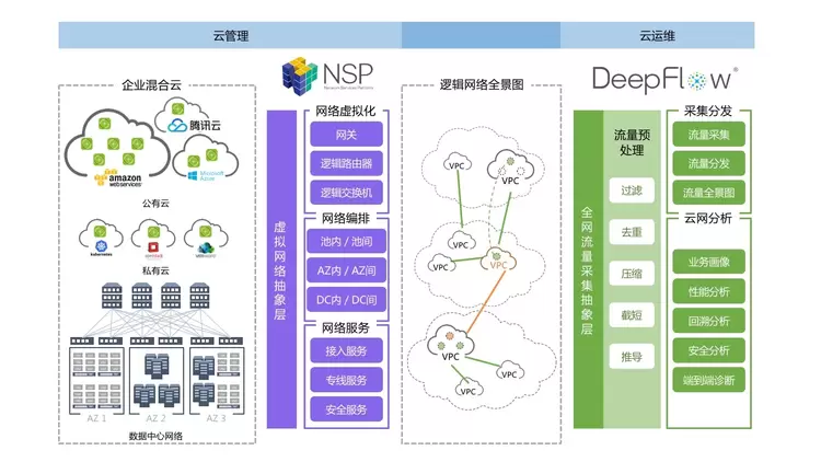 云杉网络多年来一直专注于数据中心虚拟网络监、管、控解决方案以及SDN软件产品的研发。面对多样化、复杂化的云数据中心流量采集需求,在2016年初为云用户打造了一款云网分析产品DeepFlow®。以及,针对解决数据中心虚拟网络大规模部署、异构资源池安全互联和边界网络服务问题,在今年推出了基于SDN的网络服务平台NSP(Network Service Platform)云网互联与服务。