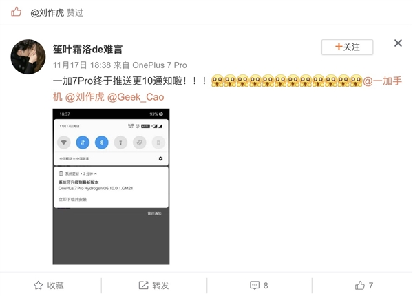 一加7 Pro正式推送Android 10.0更新:刘作虎点赞