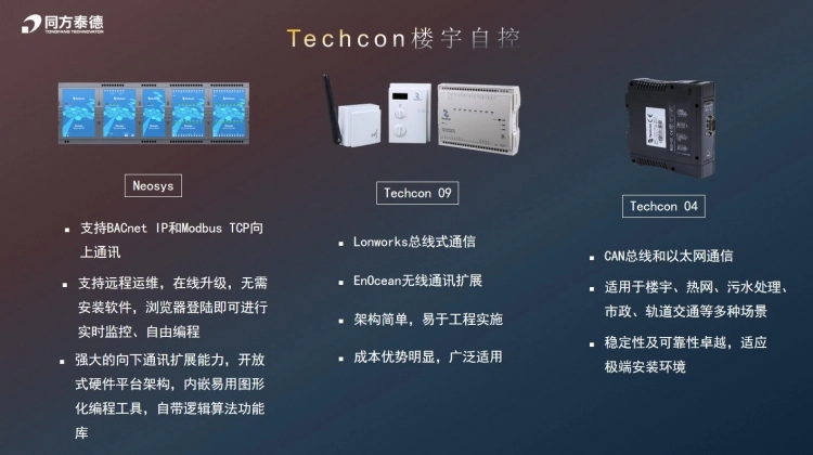 Techcon04它是由AN总线和以太网通信,完全自主可控,最大特点就是稳定性及可靠性卓越,适应极端安装环境。Techcon09系列,它是基于Lonworks总线式通信,特点就是架构简单,易于工程实施,成本优势明显,在很多项目上广泛适用。