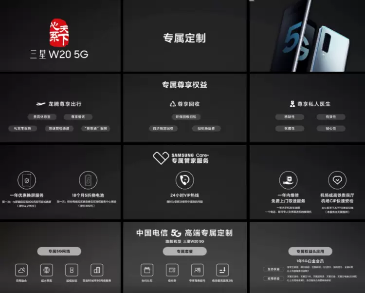 为了彰显高端用户身份,让他们在使用手机的时候更加安心,心系天下三星W20 5G提供了尊享出行、尊享维修和中国电信5G套餐专属权益。心系天下三星W20 5G用户可享受龙腾卡和机场、高铁VIP贵宾厅休息室服务,让用户出行无忧,更显从容姿态。心系天下三星W20 5G用户还可以享受一年免费上门取修服务,1年内优惠换屏、18个月内5折更换电池等尊享维修服务。在5G套餐方面,中国电信为心系天下用户提供了专属权益,心系天下三星W20 5G用户办理中国电信橙分期业务或中国电信专属合约礼包,即可获得W20专属靓号,靓号低消最高直降两档。