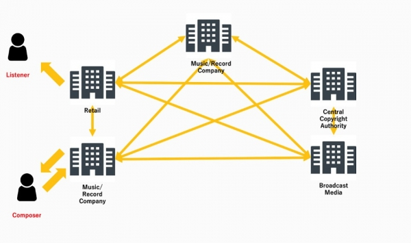 当今音乐行业里的版权信息在听众欣赏内容之前要经过许多步骤:音乐公司、版权管理机构和零售音乐服务机构都会在音乐抵达最终用户之前参与这一过程。