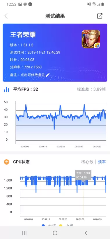 在高画质运行《王者荣耀》时,三星 Galaxy A20s 能够提供 30fps 的画面刷新率,适当降低分辨率还能够继续提升帧率表现。