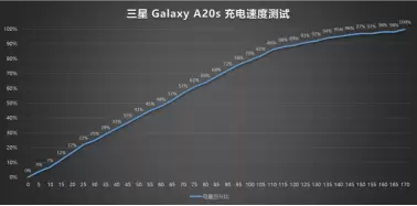 三星 Galaxy A20s 配备了 4000mAh 容量的电池,支持 15W 充电,四小时优酷视频耗电 55%,从 0 充到 100 需要 170 分钟,续航时间非常出色,充电速度略慢了一些。