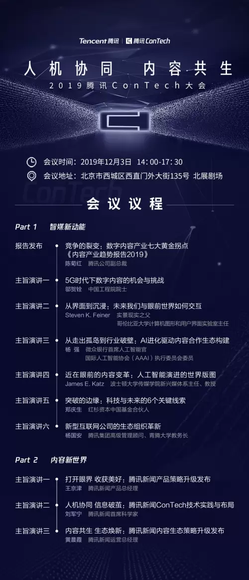 为构建一个以稳定供给优质内容为目标的长效健康生态,腾讯将于12月3日在北京展览馆剧场举办2019腾讯ConTech大会。大会以“人机协同,内容共生”为主题,邀请国内外顶尖人工智能学者、5G专家、投资决策人等业内相关人士进行现场分享。各位嘉宾将围绕“智媒新动能”和“内容新世界”两大核心议题,聚焦AI+5G时代下内容生产与消费新趋势,探讨好内容与新科技结合下的更多可能,助推内容产业抓住历史机遇、化解转型难题。