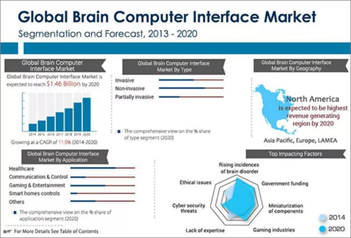 正因为如此,脑机接口技术吸引了众多的科研人员、科技企业、风险投资家、国防机构的关注和投资,而其市场预期也在逐渐升温。据预测,2020年,全球脑机接口技术的市场规模有望达到14.6亿美元。