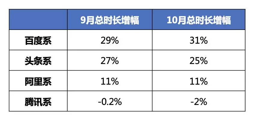 虽然移动互联网互联网整体用户时长增长进入低速前进的状态,但搜索驱动的信息知识服务需求却快速增长。QuseMobile最新报告显示,今年下半年以来,中国移动互联网用户日均总时长持续处于低增长水平,同比去年增长均不超过8%。但是百度却保持了逆势大涨的势头, 9至10月期间百度移动产品(包含百度App、好看视频、全民小视频、百度网盘等)用户总时长同比增长分别达到29%、31%,增速领先于头条系、阿里系和腾讯系。