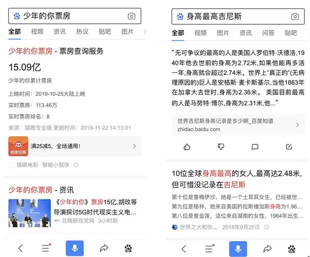 信息获取是百度App最基本的功能之一,最新数据显示,百度搜索的首条满足率已经达到了56%,也就是说大家现在百度一下,有一半以上的答案是直接给出的唯一答案,而一年以前,这一数据还是40%左右,首条满足率比例的提升,改善了用户搜索体验。