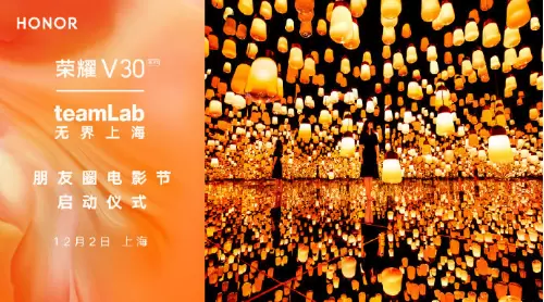 视频记录日常的方式越来越受到大家的青睐,进入5G时代后,视频产业会有更大的发展空间,更多人进入此行业,对视频作品的要求也会更高,手机作为最方便的拍摄工具,不断提高其影像能力已成为行业的重要前进方向。荣耀V30作为荣耀首部全系5G全国通手机,在视频创作领域,必然会顺应5G时代要求:它搭载相机矩阵,能为用户带来专业级别的拍摄体验。此次荣耀举办朋友圈电影节,也为让大家感受到荣耀在手机影像前进中的最新变化。第一届朋友圈电影节将于12月2日揭幕,届时,荣耀会与@teamlab无界上海 携手展开主题日活动。