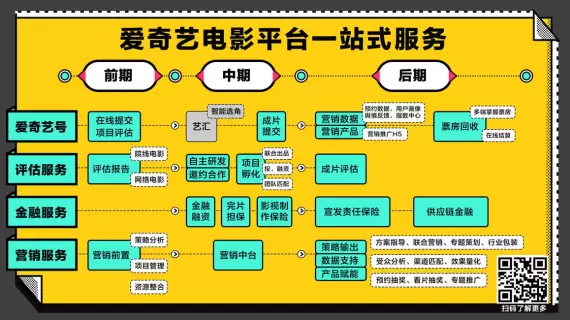 作为网络电影模式的开创者和付费用户规模破亿的视频平台,爱奇艺搭建开放平台,为合作方的内容生产开放多维服务与数据支持。2018年,开辟网络电影前期评估服务,全方位为合作方降低风险。截止目前,已评估了2570个前期项目,收到了1965部成片提交,并涌现出多部成功案例。同时,爱奇艺开放数据,连接内容方与用户,在内容创作、运营、营销、货币化等核心环节赋能合作伙伴。在资金方面,爱奇艺通过投资或推荐第三方资本搭建完整资金供给链条,同时引入完片担保和影视制作保险等产品结合供应链金融打造一站式金融服务,免除创作者资金方面的后顾之忧。