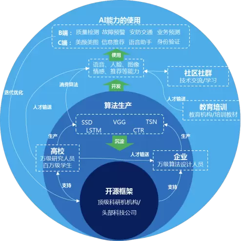 图示:深度学习框架在AI产业生态中扮演者操作系统的角色,是AI产业生态的核心基础