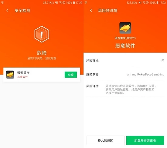 (图:腾讯手机管家精准查杀“漫游重庆”赌博病毒软件)