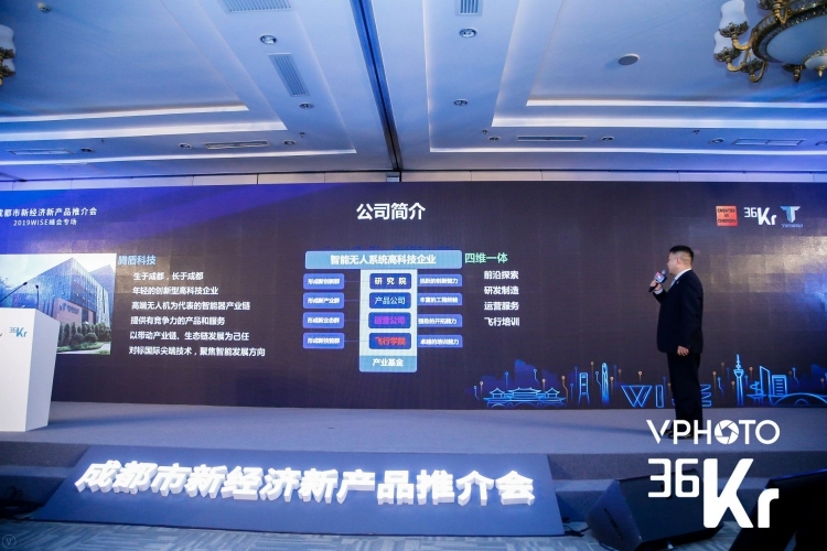11月26日,36氪“2019WISE新经济之王大会”在北京国际会议中心拉开帷幕,作为重要分论坛,成都新经济新产品2019WISE专场推介会同期举行,期间,成都极具代表性的新经济企业进行了新产品推介,无人机装备和服务供应商「腾盾科技」便是其一。