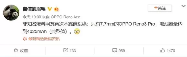 11 月 29 日,OPPO 副总裁沈义人再次在微博爆料:" 非知名爆料网友再次不靠谱投稿:只有 7.7mm 的 OPPO Reno3 Pro,电池容量达到 4025mAh(典型值)"